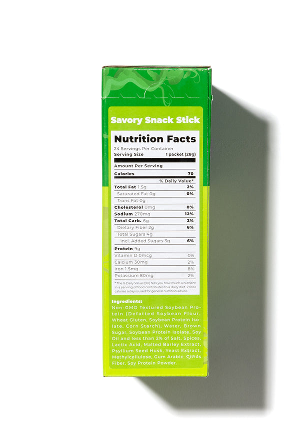 Beanstalk Original Savory Snack Sticks are tender chewy protein sticks with the right amount of jerky flavor. Lower in calories than traditional animal jerky, Savory Snack bites have 9 grams of plant-based protein per serving and are individually wrapped for freshness. 100% plant-based and non-GMO, Savory Snack bites are family-friendly and perfect for lunch boxes or on-the-go snacking.