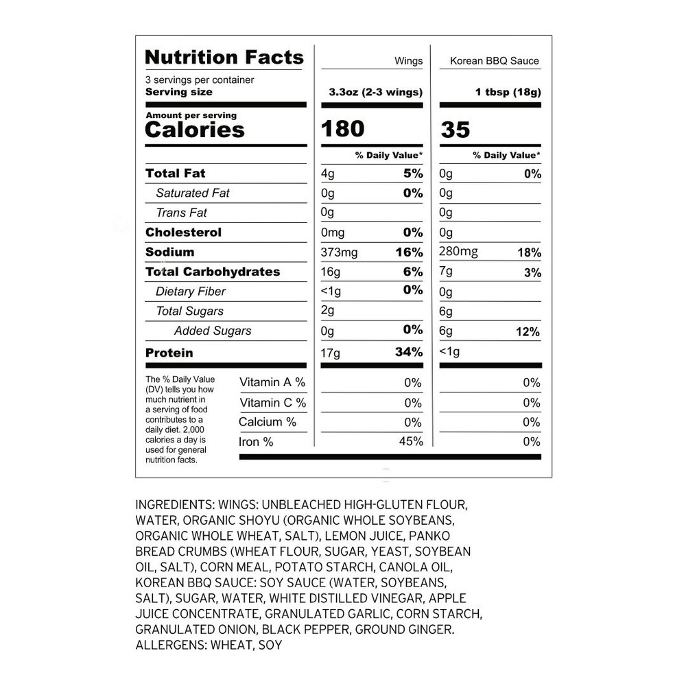 Ingredients: Wings (Unbleached high-gluten flour, water, organic shoyu (organic whole soybeans, organic whole wheat, salt), lemon juice, panko bread crumbs (wheat flour, sugar, yeast, soybean oil, salt), corn meal, potato starch, canola oil) Korean BBQ Sauce (soy sauce (water, soybeans, salt), sugar, water, white distilled vinegar, apple juice concentrate, granulated garlic, corn starch, granulated onion, black pepper, ground ginger) Allergens: Wheat, Soy
