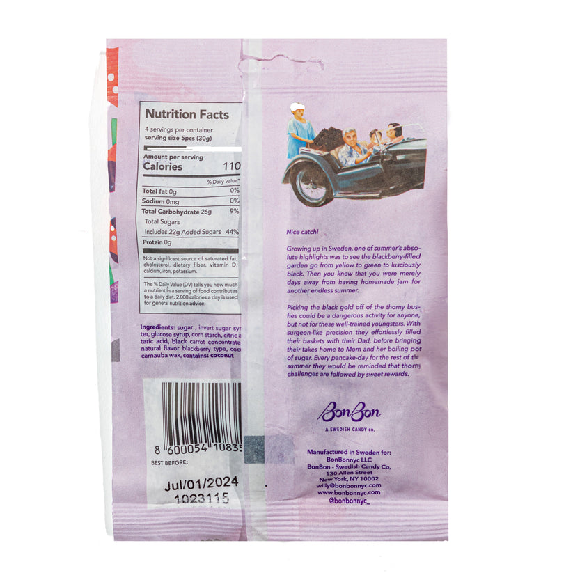 Ingredients: sugar , invert sugar syrup, water, glucose syrup, corn starch, citric acid, tartaric acid, black carrot concentrate (color), natural flavor blackberry type, coconut oil, carnauba wax, contains: coconut