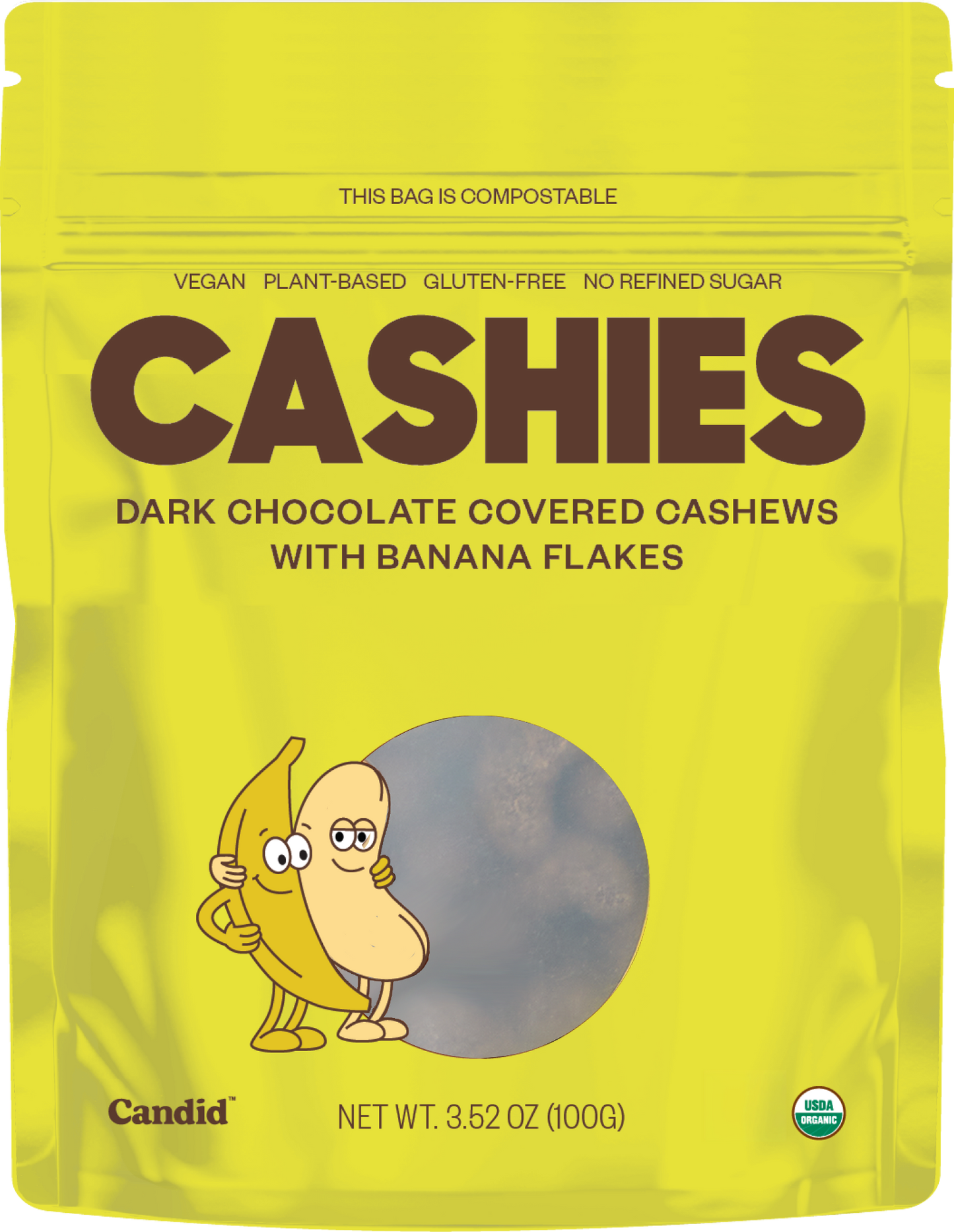 CASHIES are lightly roasted cashews covered in organic, dark chocolate and dusted with banana flakes. Highly snackable