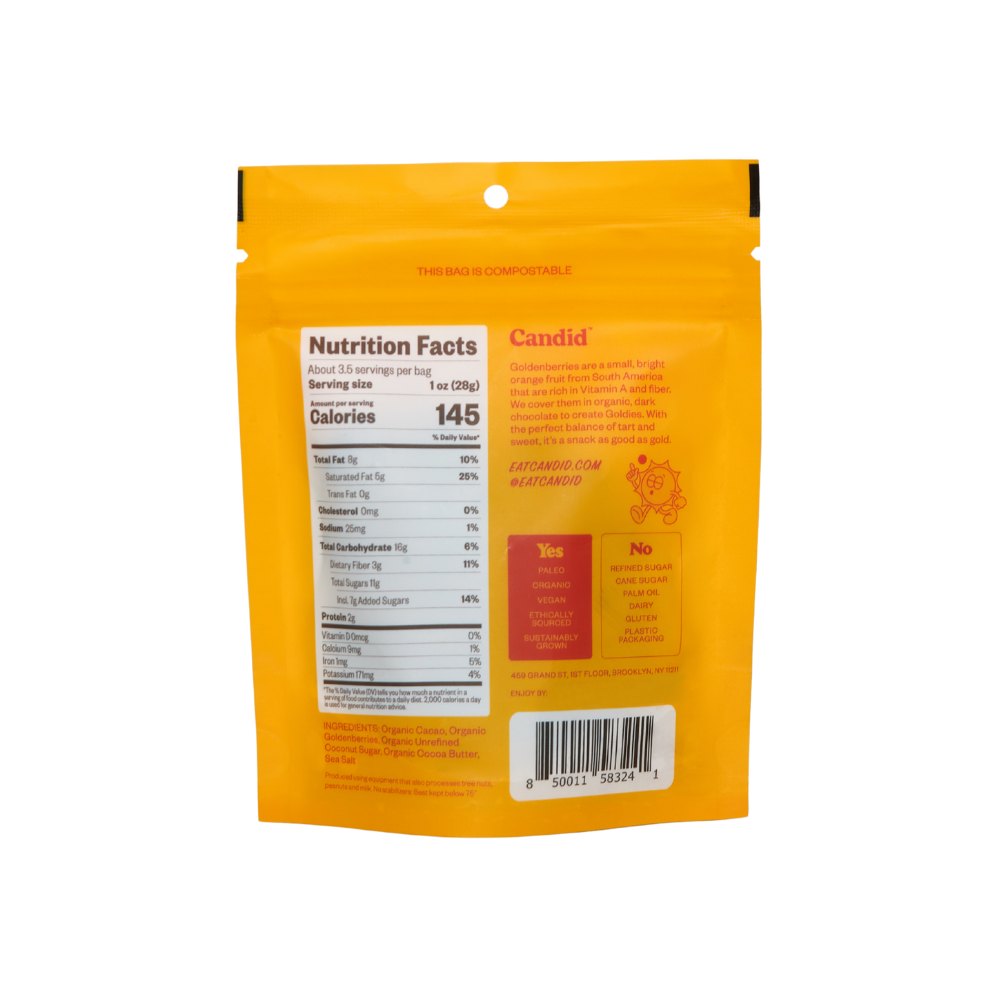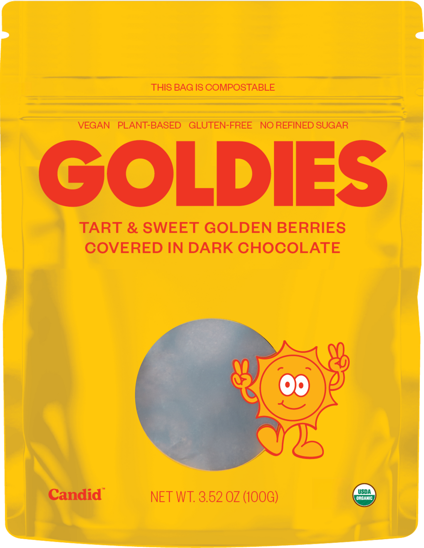The golden berry is a small, bright orange-colored fruit from South America that's rich in Vitamin A and fiber. We cover them in organic, dark chocolate to create Goldies. With the perfect balance of tart and sweet, it’s a snack as good as gold.