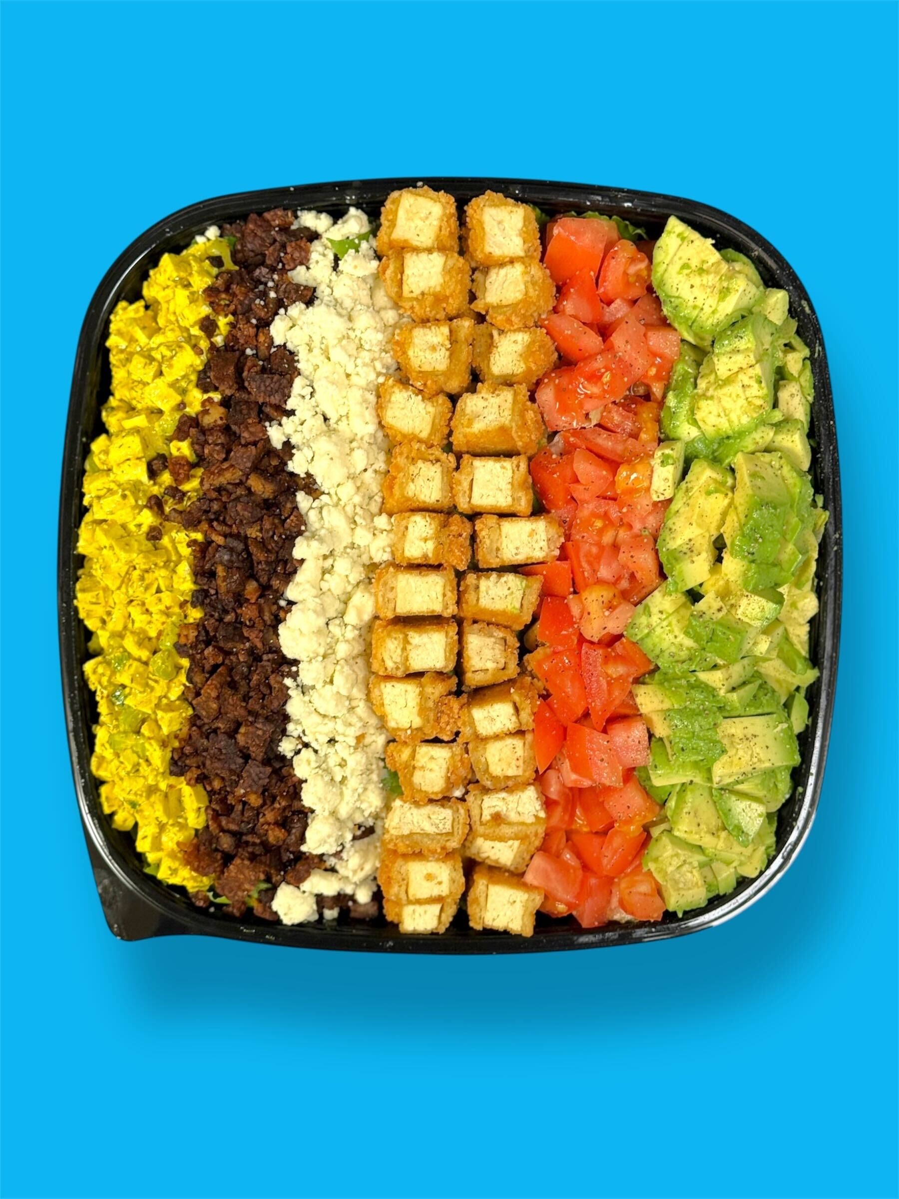 The Orchard Cobb salad: chopped romaine lettuce topped with cherry tomatoes, house tempeh bacon, red onion, bleu cheese crumbles, sunflower seeds, tofu fried chicken and tofu egg salad. Served with house made ranch dressing.