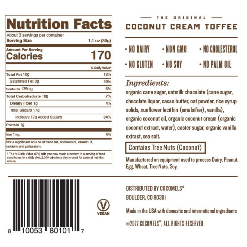 - Crunchy coconut cream toffee covered in smooth, creamy oatmilk chocolate