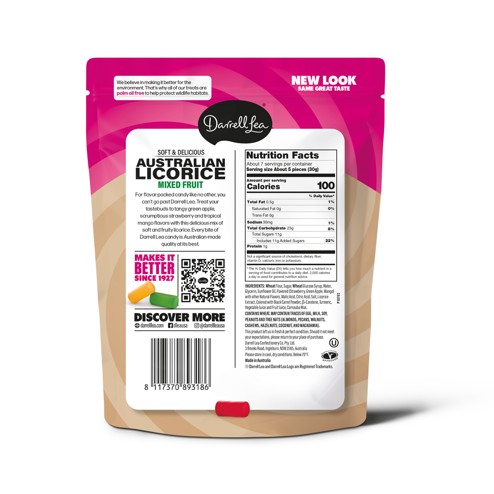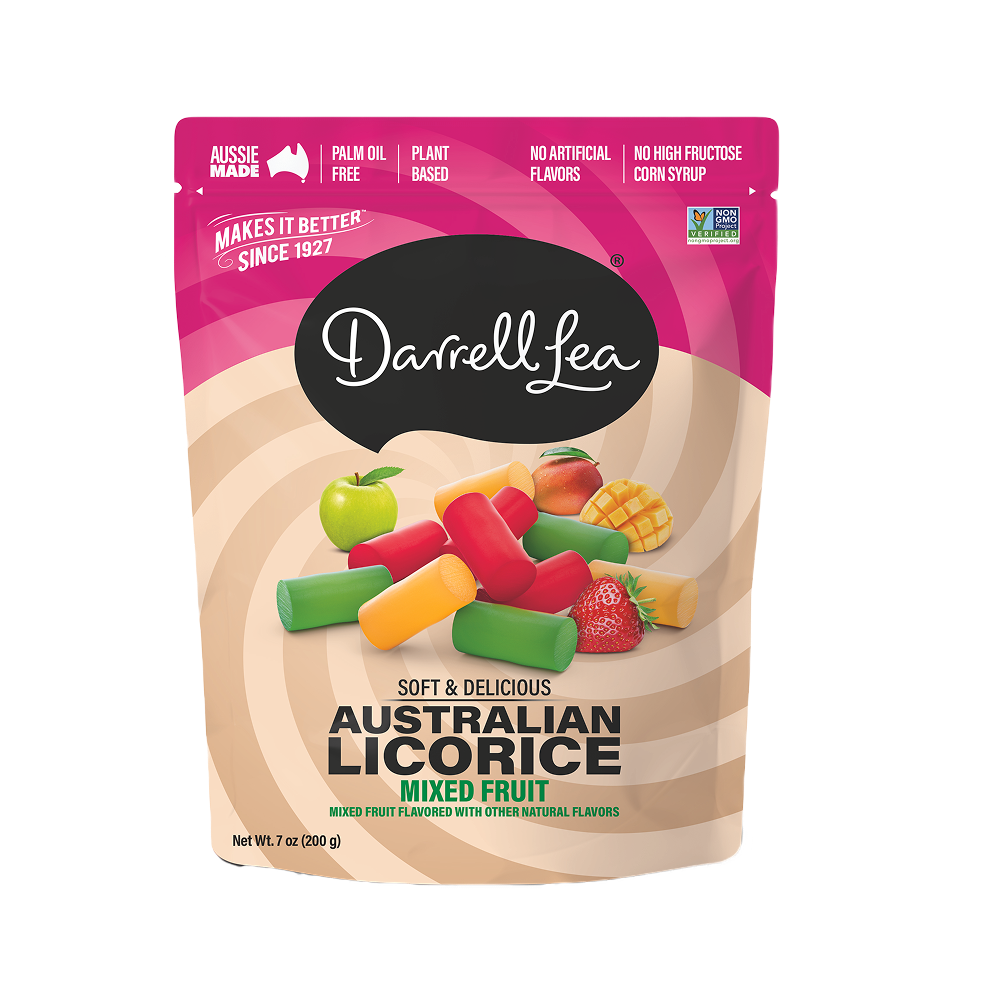 If there’s one thing Darrell Lea knows, it’s licorice. Taste it in our 100% Aussie made, soft licorice. It’s full of delicious strawberry, mango and green apple flavor offering a combination of irresistible taste and texture.