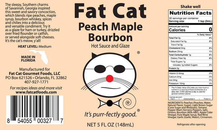 INGREDIENTS: Peaches (Peaches, Water, Natural Flavor, Sugar), Brown Sugar (Sugar, Molasses), Serrano Pepper Mash (Serrano Peppers, Salt), Onions, Bourbon (40% ABV), Apple Cider Vinegar, Pure Maple Syrup, Red Wine Vinegar, Garlic (Garlic, Water), Cinnamon