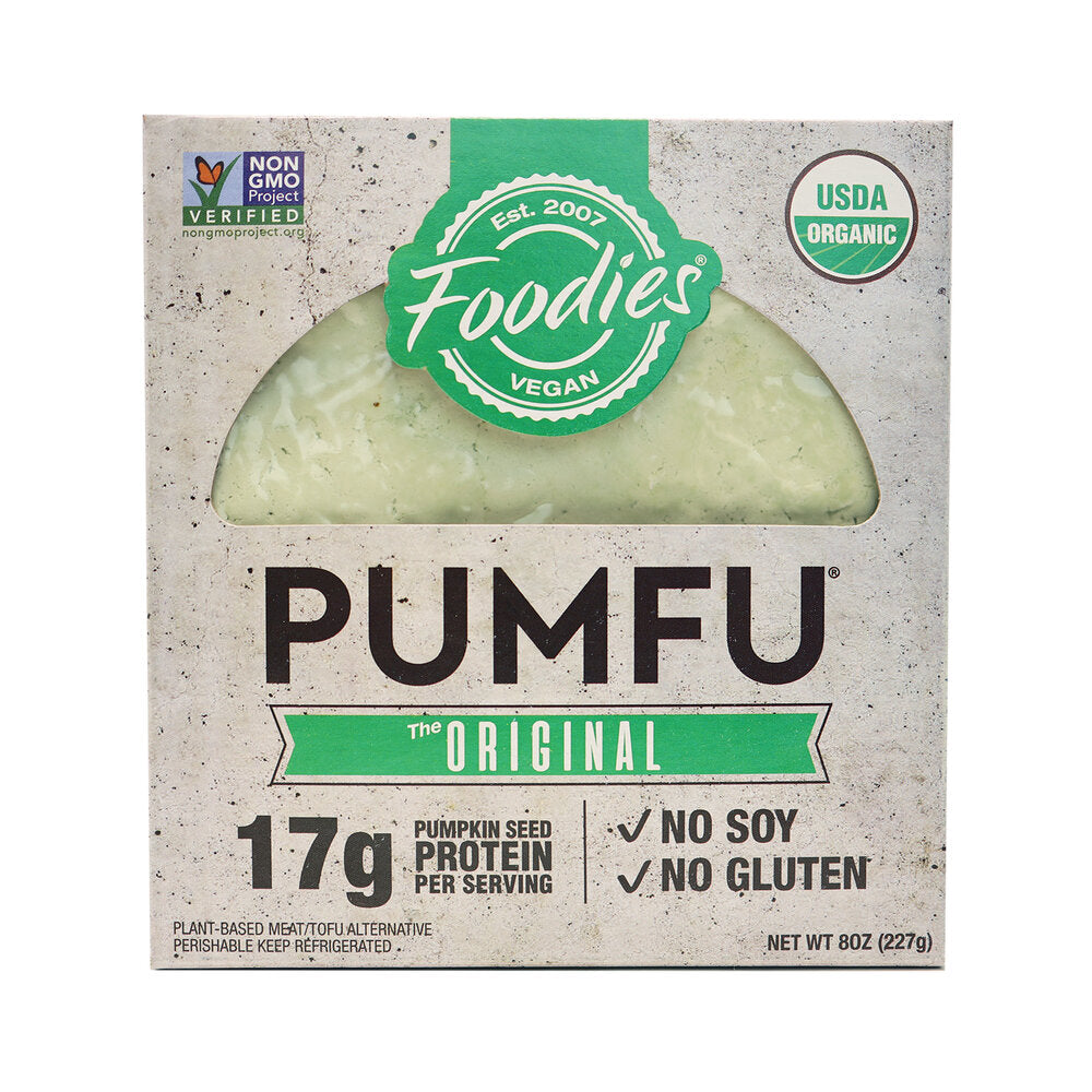 8 oz. Refrigerated. Organic and soy-free, nut-free, and gluten-free. Pumfu is a game changing, plant-based protein, made from organic pumpkin seeds. It is an amazing alternative to meat, tofu, eggs, cheese and more! It has a mild nutty taste, a firm texture and takes on flavor super easily.