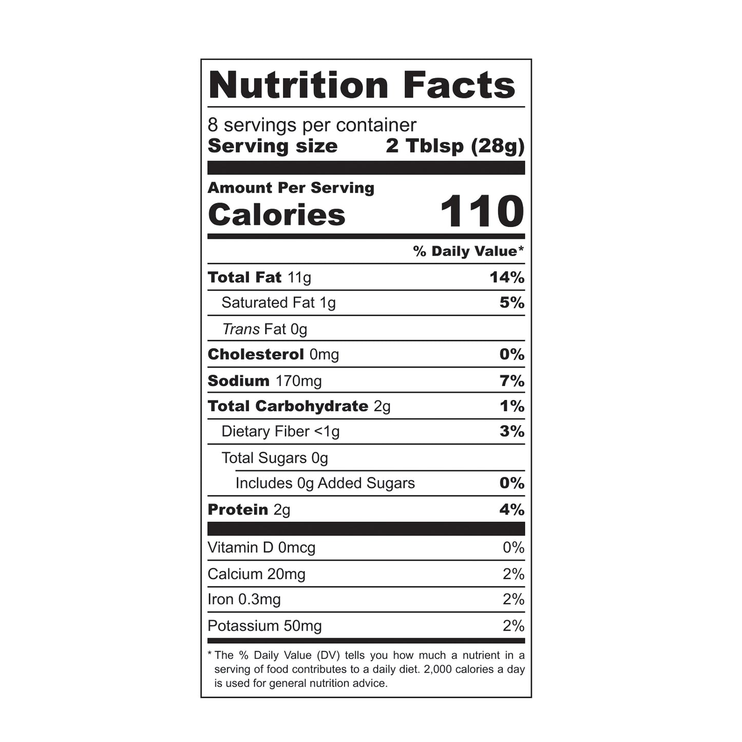 Ingredients: Avocado Oil, Water, Organic Almonds, Distilled Vinegar, Cilantro, Bragg Liquid Amino Acids (Vegetable Protein From Soybeans, Water), Lime Juice, Nutritional Yeast, Garlic, Citric Acid, Sea Salt, Jalapeno, Cumin, Xanthan Gum.