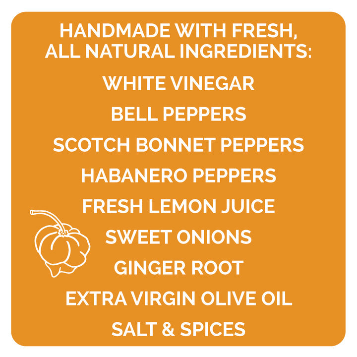 Ingredients: White vinegar, bell peppers, scotch bonnet peppers, habanero peppers, sweet onions, lemon juice, ginger root, extra virgin olive oil, salt & spices.
