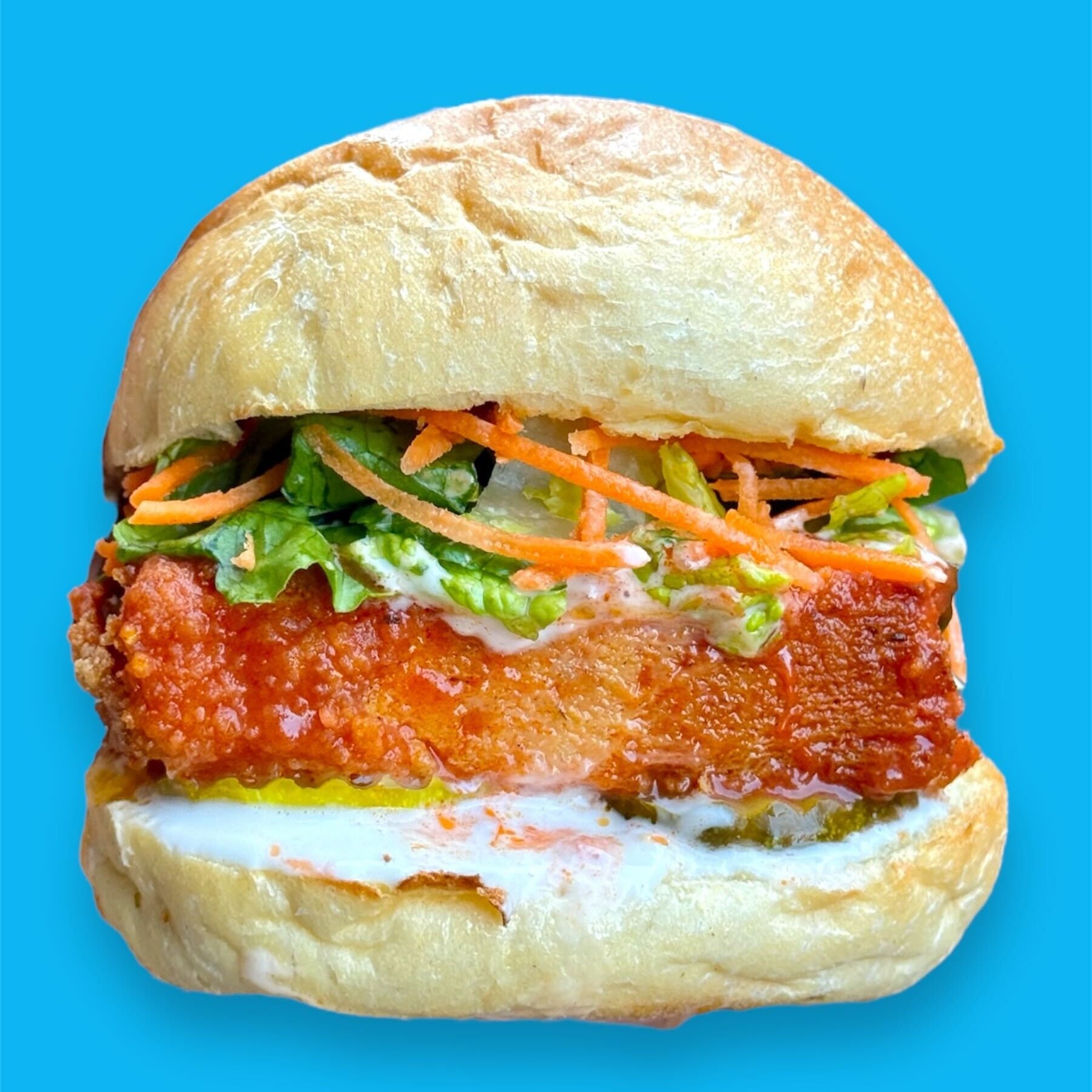 House made fried tofu chik'n, tricolor slaw, pickled onions, buffalo sauce, and house made ranch on a roll.
