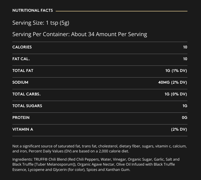Made with the finest red chili peppers and infused with black winter truffle. Add it to a slice of pizza or some avocado toast. Mild to medium hot sauce.