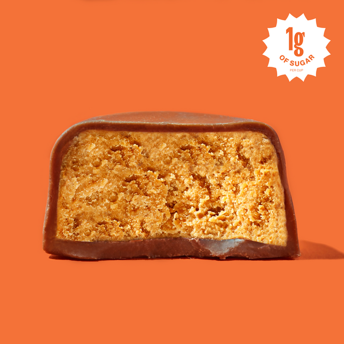 1 individually-wrapped peanut butter cup. 1g of sugar. Plant-based. Palm oil-free. Gluten-free. GMO-free.